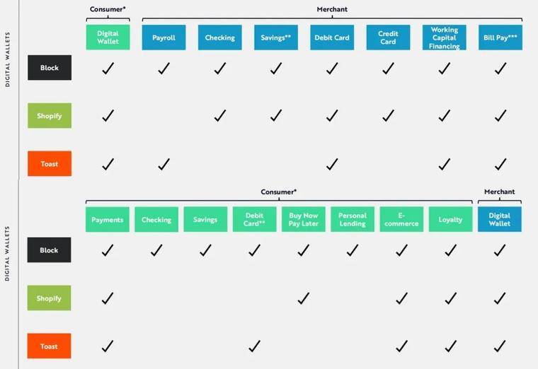 Block、Shopify 和 Toast 都是极具吸引力的平台,它们很可能将数字钱包作为连接消费者、商家和员工生态系统的核心。除了支持核心业务运营,它们以数字钱包为核心,与合作银行和金融科技公司合作,或激活自己的银行执照,从而能够消除与无数商家互动中,效率较低的传统金融机构服务。