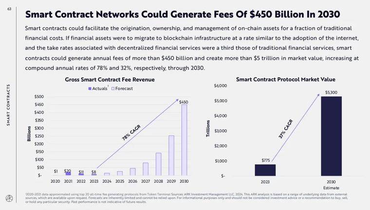 智能合约可以以远低于传统金融的成本,来促进链上资产的创建、所有和管理。如果代币化资产以类似于互联网采用的速度迁移到区块链基础设施,并且与 DeFi 相关的服务费率是传统金融服务的三分之一,那么智能合约每年可以产生超过 4500 亿美元的服务费用,创造超过 5 万亿美元的市场价值,到 2030 年分别以 78% 和 32% 的复合年增长率增长。