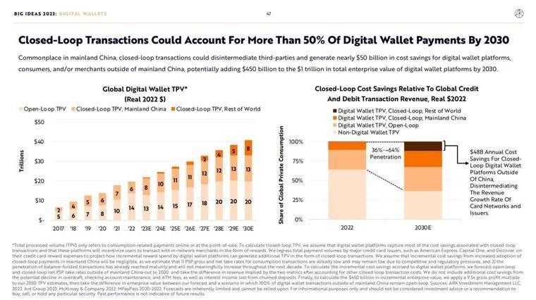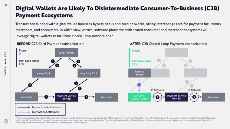 使用数字钱包余额进行的交易绕过了银行和银行卡网络,为支付服务商、商家和消费者节省了交易费用。在 ARK 看来,具有规模化消费者和商家生态系统的垂直软件平台可以较好地利用数字钱包来促进闭环交易,实现最大收益。