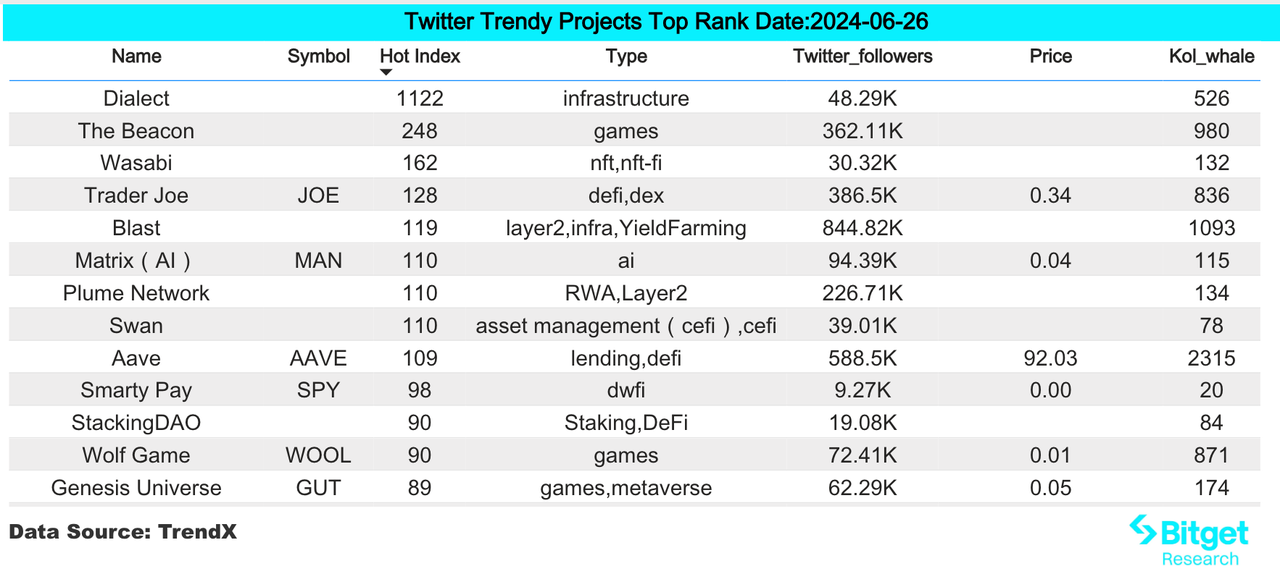过去 24 小时,比特币回升突破 62000 USDT,日内涨幅为 2.83% 。以太坊升破 3400 USDT,日内涨幅为 1.43% 。MEME 类代币普涨,WIF、PEPE、BONK 等 24 小时涨幅均超 10% 。同时,昨日 Blast 基金会宣称将于北京时间 6 月 26 日 22: 00 向社区空投 BLAST。Blast 公布代币经济模型, BLAST 总供应量为 1000 亿枚, 50% 将空投给社区,初始空投量为 170 亿枚,Blast 目前已是第六大链上经济体,Bitget 推出 BLAST 限时空投,投资者可保持关注。