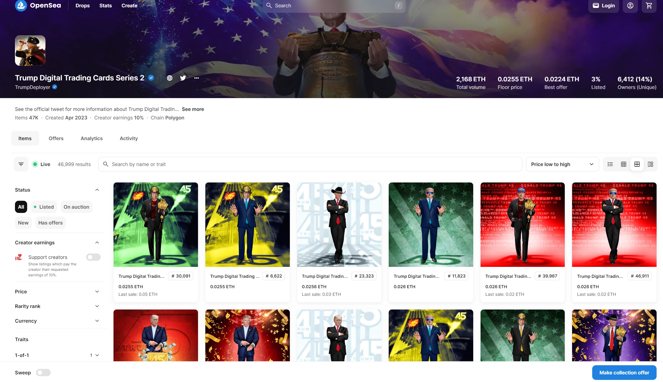 2023 年 4 月 19 日,特朗普在其社交平台 Truth Social 上宣布推出 Trump Digital Trading Cards 的第二季。该系列 NFT 同样铸造在 Polygon 区块链上,每张售价 99 美元,共发行 47, 000 枚,其中 46, 000 枚可供出售。第二系列一经推出,再次引发了市场的广泛关注和投资热潮。