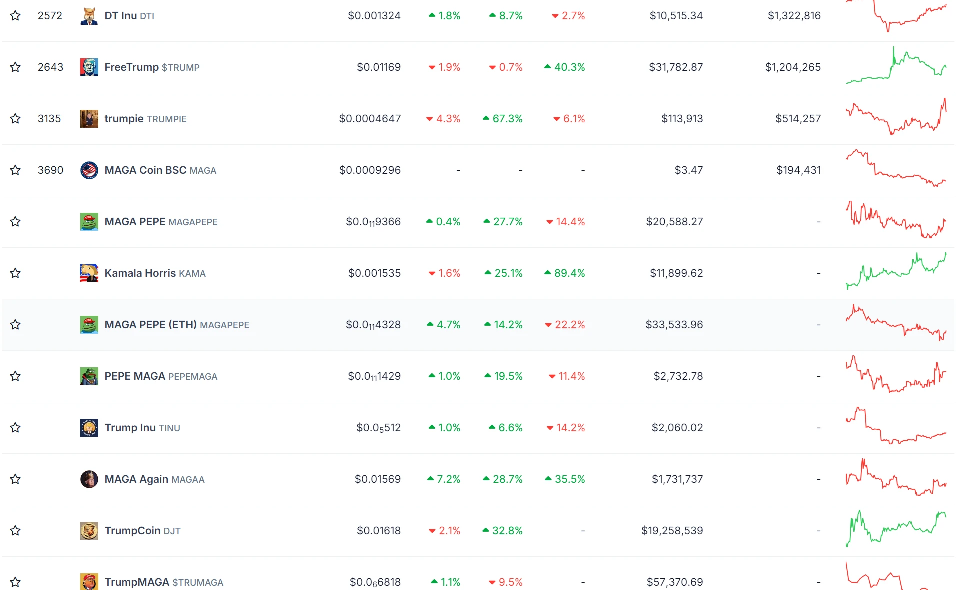 与拜登政府相比,特朗普更加公开表达对加密货币的热爱和了解。这也说明特朗普可能会推动更加有利于加密货币发展的监管环境。此前他也一再提到要确保让 Crypto 再次伟大并发生在美国。市场上已经出现了许多与特朗普相关的代币,数量比拜登相关的多得多,这些与美国总统竞选相关的 Meme 代币,可能会在激烈的辩论期间受到关注,下面我们一起来看一下潜在的布局机会: