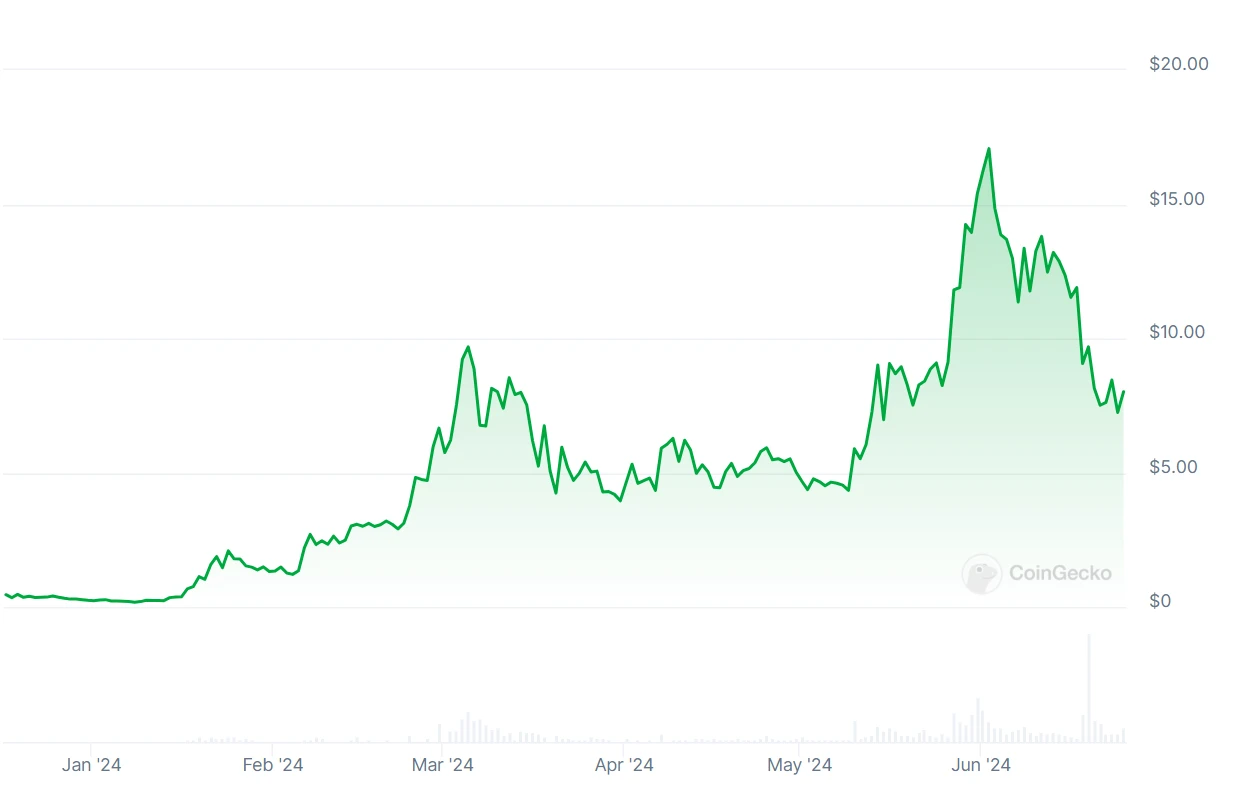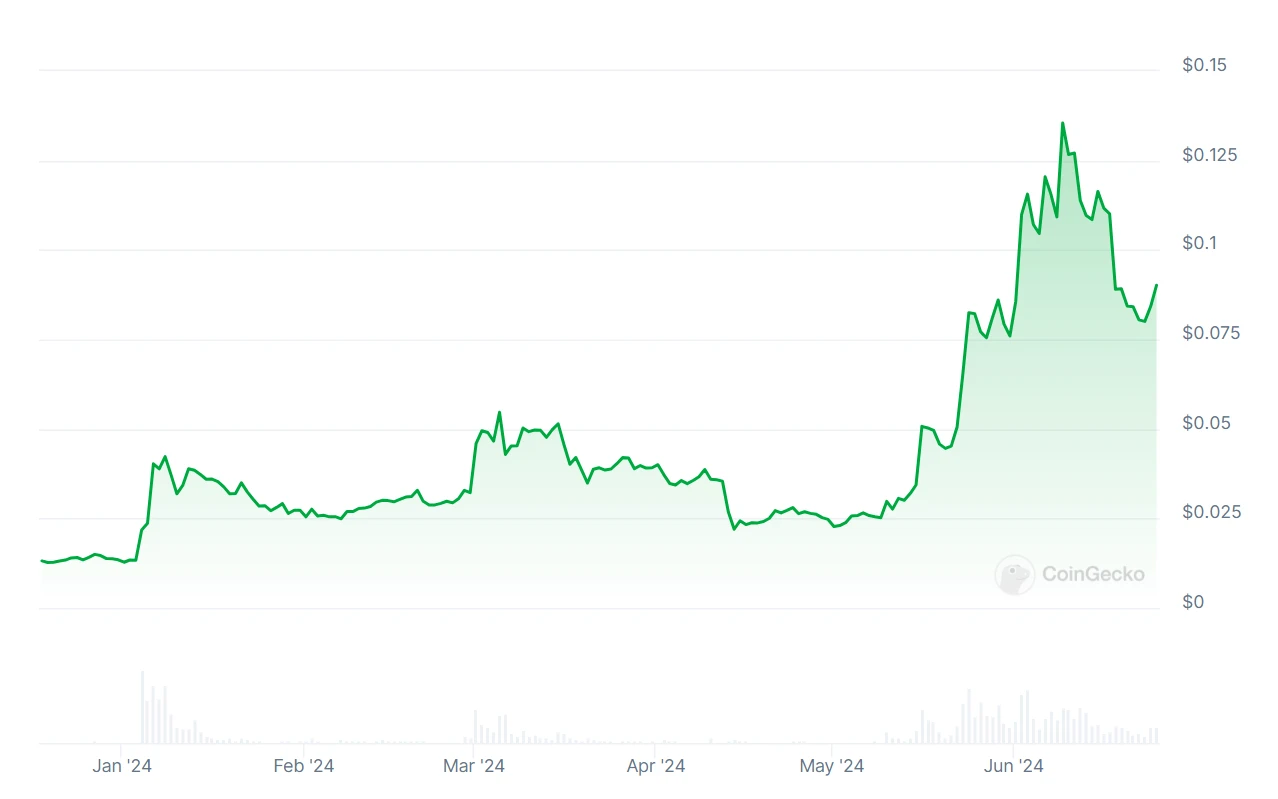 5. DJT(TrumpCoin): 著名外媒 Pirate Wires 在 6 月 17 日发帖称特朗普将推出一种官方代币 TrumpCoin,代币名为 DJT,还称其 18 岁的儿子巴伦 (Barron) 是该代币的实际操控者。消息一出, DJT 价格一度冲高至 0.04 美金以上,后续特朗普团队尚未证实其代币发行,经过一系列谣言传出和辟谣,DJT 日内最高跌幅近 66.7% 。目前价格已回落至 0.013 美金一枚,市值 1.64 亿美金。