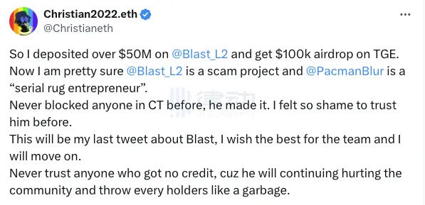 加密基金 NDV 联合创始人 Christian 表示 自己在 blast 上存入超 5000 万美元,获得 20, 912, 000 枚 BLAST,价值约 54 万美元,但由于线性解锁目前只能领到 10 万美元的空投。Christian 将 blast 标榜为骗局项目,并将其创始人 Pacman 称为「连续 rug 企业家」。