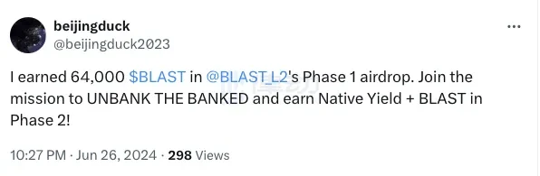 从 Twitter 运营上看,@beijingduck 2023 似乎是一个为 blast 积分开创的新号,其本人并未发表过多关于 blast 的看法,而其他获得 BLAST 的大户就显得没那么冷静了。