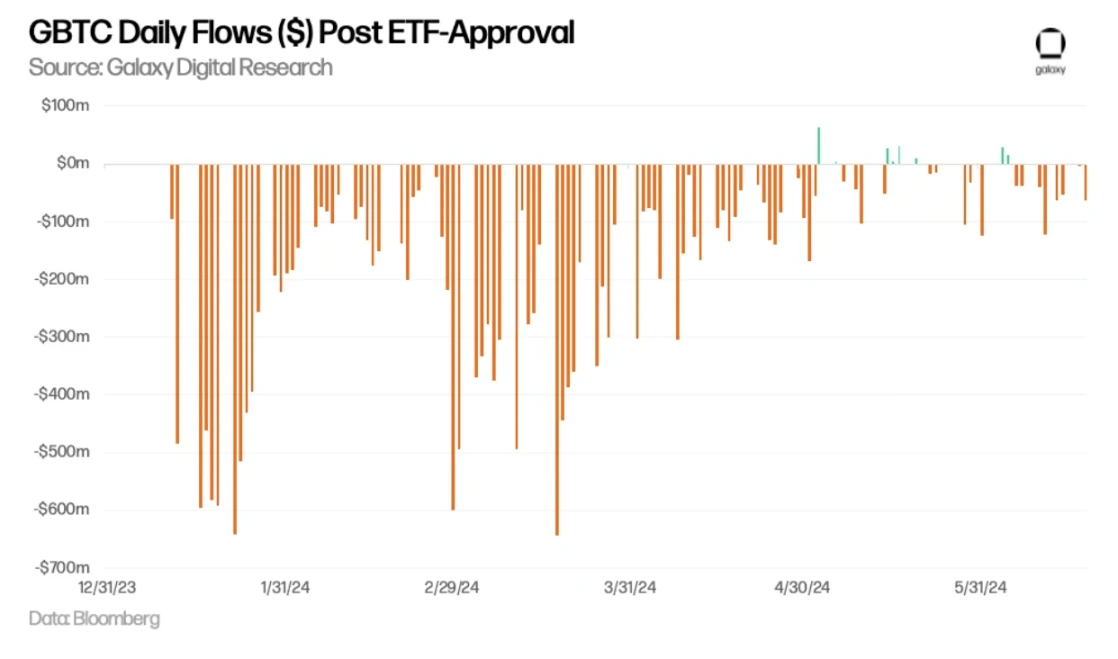 GBTC 一直是 ETF 整体流动的一大隐患。自将信托转换为 ETF 以来,GBTC 在最初几个月经历了大量资金流出。GBTC 每日资金流出量在 3 月中旬达到峰值, 2024 年 3 月 18 日的资金流出量为 6.42 亿美元。此后资金流出量有所缓和,GBTC 甚至从 5 月份开始出现了几天的正净流入。截至 6 月 15 日,自 ETF 推出以来,GBTC 持有的 BTC 余额已从 61.9 万枚下降至 27.8 万枚。