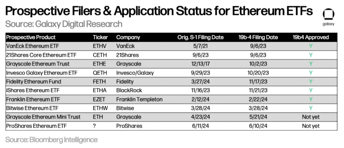 5 月 23 日,美国证券交易委员会批准了所有 19 b-4 文件(允许证券交易所最终上市 ETH 现货 ETP 的规则变更),但现在每个发行人都需要与监管机构反复讨论其注册声明。直到美国证券交易委员会允许这些 S-1 文件(或 ETHE 的 S-3 文件)生效,产品本身才能真正开始交易。根据我们的研究以及彭博社的报道,我们认为以太坊现货 ETP 最早可能在 2024 年 7 月 11 日当周开始交易。
