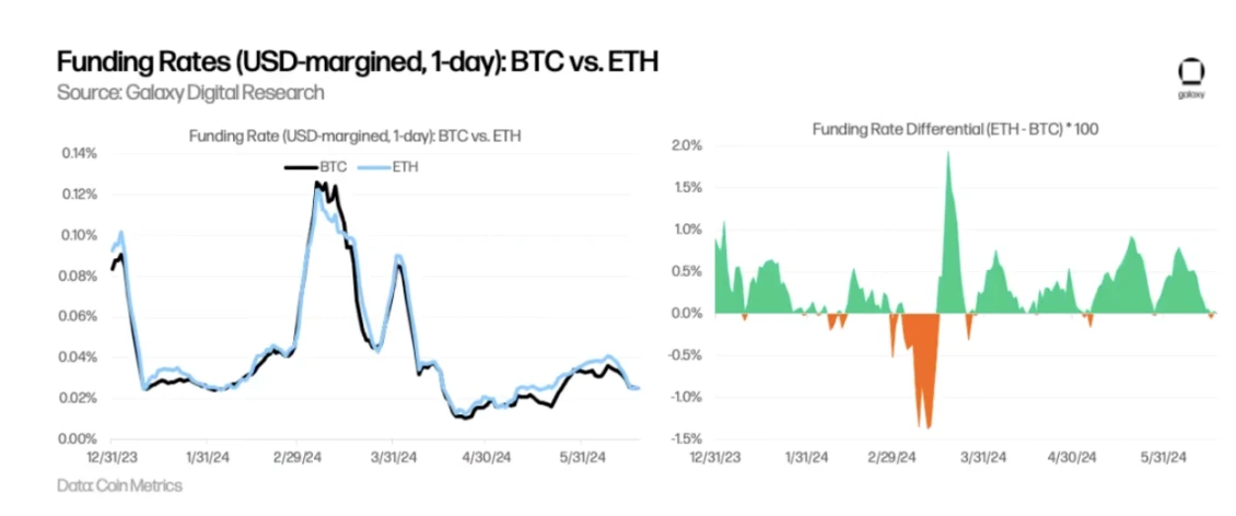 基差交易可能推动了对冲基金对比特币 ETF 的需求。 基差交易可能推动了对冲基金对比特币 ETF 的需求,这些对冲基金希望从比特币现货和期货价格之间的差异中进行套利。如前所述, 13 F 文件显示,截至 2024 年 3 月 31 日,超过 900 家美国投资公司持有比特币 ETF,其中包括一些知名对冲基金,如 Millennium 和 Schonfeld。在整个 2024 年,ETH 在各交易所的融资利率平均高于 BTC,这表明 (i) 做多 ETH 的需求相对较大,(ii) 现货以太坊 ETF 可能会带来更多利用基差交易的对冲基金的需求。