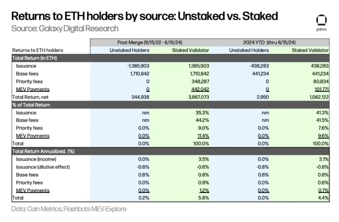 由于缺乏质押奖励,现货以太坊 ETF 的需求可能受到影响。 非质押的 ETH 具有放弃以下行为的机会成本:(i) 支付给验证者的通胀奖励、(ii) 支付给验证者的优先权费用,以及通过中继器支付给验证者的 MEV 收入。根据 2022 年 9 月 15 日至 2024 年 6 月 15 日期间的数据,我们估计放弃质押奖励的年化机会成本对于现货 ETH 持有者为 5.6 %(若使用年初至今数据得出结果为 4.4% ),这是一个不小的差异。这会降低现货以太坊 ETF 对潜在买家的吸引力。请注意,在美国以外其他地方(例如加拿大)提供的 ETP 通过质押为持有人提供额外收益。