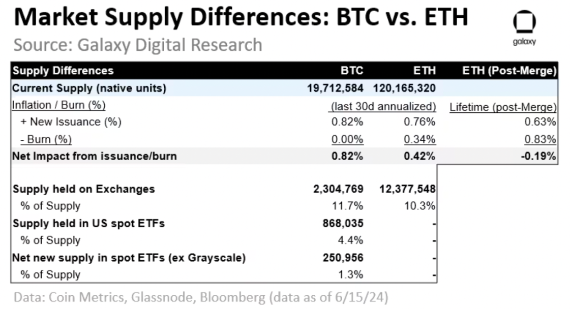 由于我们估计的以太坊 ETF 流入量与市值的比例大致等于比特币流量与市值之比,因此我们预计在其他所有条件相同的情况下,价格影响也大致相同。然而,这两种资产的供需存在几个关键差异,这可能导致以太坊价格对 ETF 流量更为敏感: