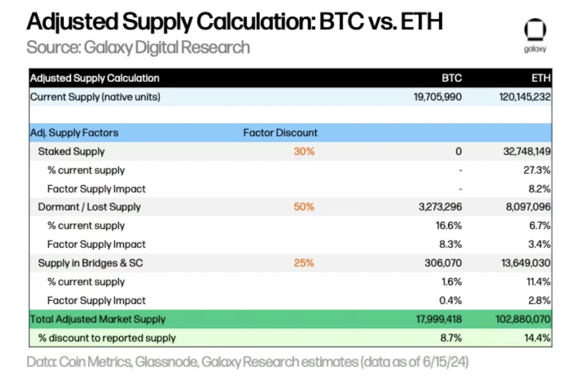 对每个因素应用折扣权重来计算 BTC 和 ETH 的调整后供应量,我们估计 BTC 和 ETH 的可用供应量分别比报告的当前供应量少 8.7% 和 14.4% 。