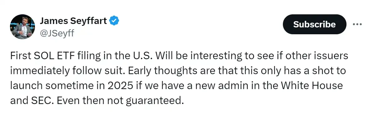 彭博社 ETF 分析师 James Seyffart 在社交媒体上发文表示,Solana ETF 比想象中「来的更早」,但通过率仍是未知数。无论通过与否,这足以让沉寂的加密社区兴奋,毕竟这一轮市场可谓是 ETF 牛市。