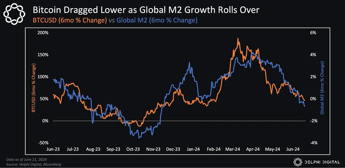 我认为这张图表说明了一切—— 全球 M2 (全球流动性的一个重要因素) 的增长速度自 3 月底/4 月初以来明显放缓。 市场是前瞻性的,如果 M2 的前景放缓,市场将预期美元相对于加密货币(在其他条件相同的情况下)走强。