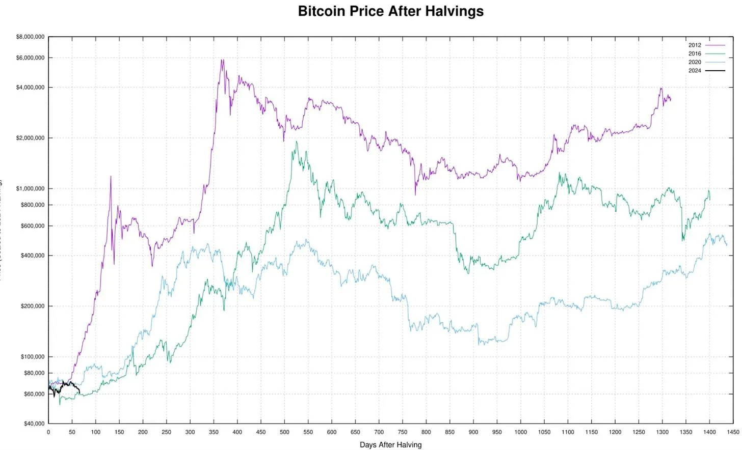 好消息是,我不认为这是周期顶部(如果在 ETF 等因素下,周期顶部的概念仍然存在的话)。正如我在开头提到的,我认为这在减半后的几周和几个月内是相当典型的。每个周期显然不同,但我认为基本原则大致相同: