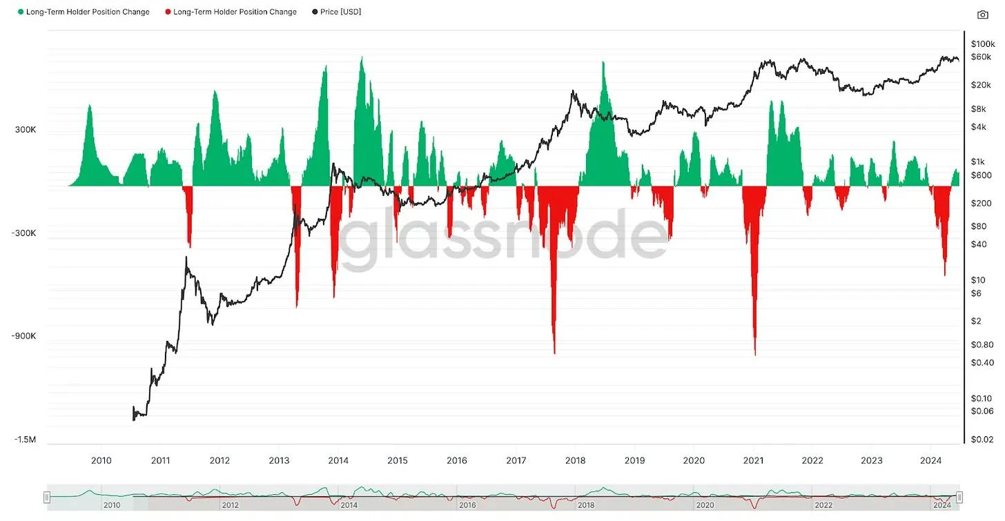 另一个有趣的指标是 长期持有者头寸的变化 ,定义为持有比特币超过 155 天的钱包。 顶部通常在这些持有者完成出售时形成,而底部则在他们开始购买时形成。 从 1 月底到 3 月底,可以明显看到抛售量急剧增加。更重要的是,他们也开始重新购买。