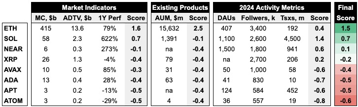 现有产品资管规模(Existing Product AUM):代币现有投资产品的全球资产管理规模较高,预示着现货 ETF 产品的需求可能会很好。