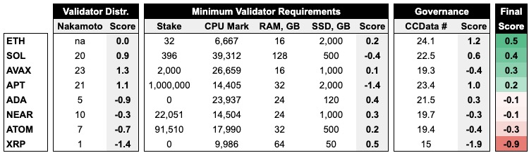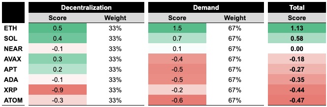 GSR 认为,这两个因素中,去中心化更多的是一个门槛因素,而潜在需求可能是发行商使用的主要标准,因此分别以 33% 和 67% 的权重计算两者得分。在将两个数据相加后, GSR 得出的最终结果是,以太坊以较大优势排名第一,其次是 Solana 和 NEAR。与第三名 NEAR 的得分相比,SOL 与之拉开了较大的差距。此外,SOL 也是除 ETH 之外唯一在去中心化和需求方面都获得正分的加密货币。