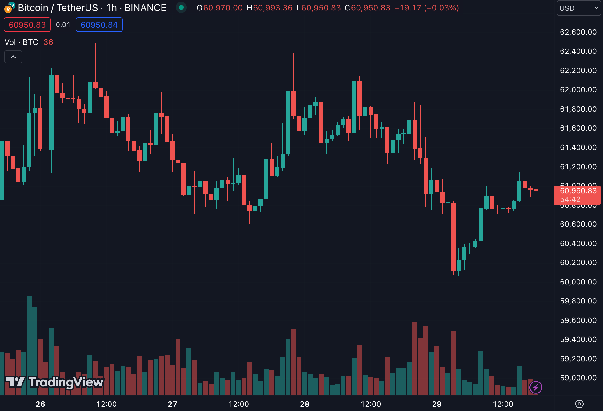比特币价格方面,昨晚从 61,875 美元下挫超 2.8%,一度下探 6 万美元,最低跌至 60,079 美元,截稿前已回到 60,950 美元,近 24 小时下跌 1.1%。