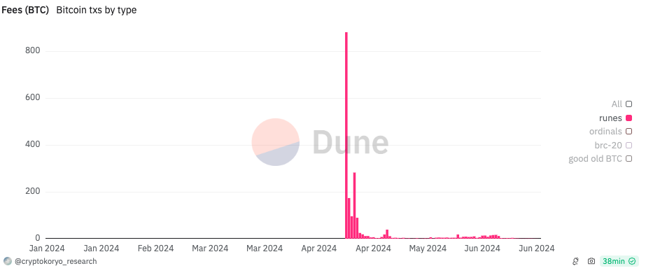 另一方面,Ordinals 铭文和 BRC-20 代币提供给矿工的交易费用相比符文甚至更低,而这些协议最初被认为是比特币矿工的新收入来源。