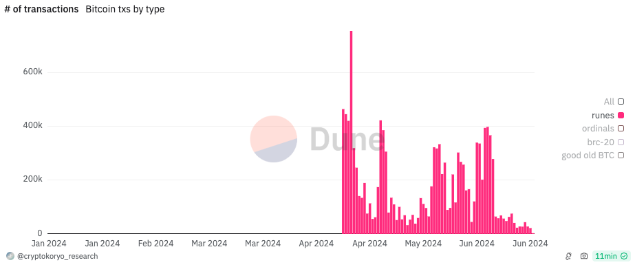 比 特币生态熄火!根据 Crypto Koryo 的 Dune Analytics 数据 ,围绕在比特币生态的新代币标準 Runes 的每日平均交易量在 6月 22 日至 28 日期间仅为37,820笔,较 6 月 9 日至 15 日期间的日均 331,040 笔下降近 90%,而 6 月 24 日的交易量仅有 23,238 笔,创下自 4 月 20 日比特币第四次减半推出该协议以来的最低交易量记录。