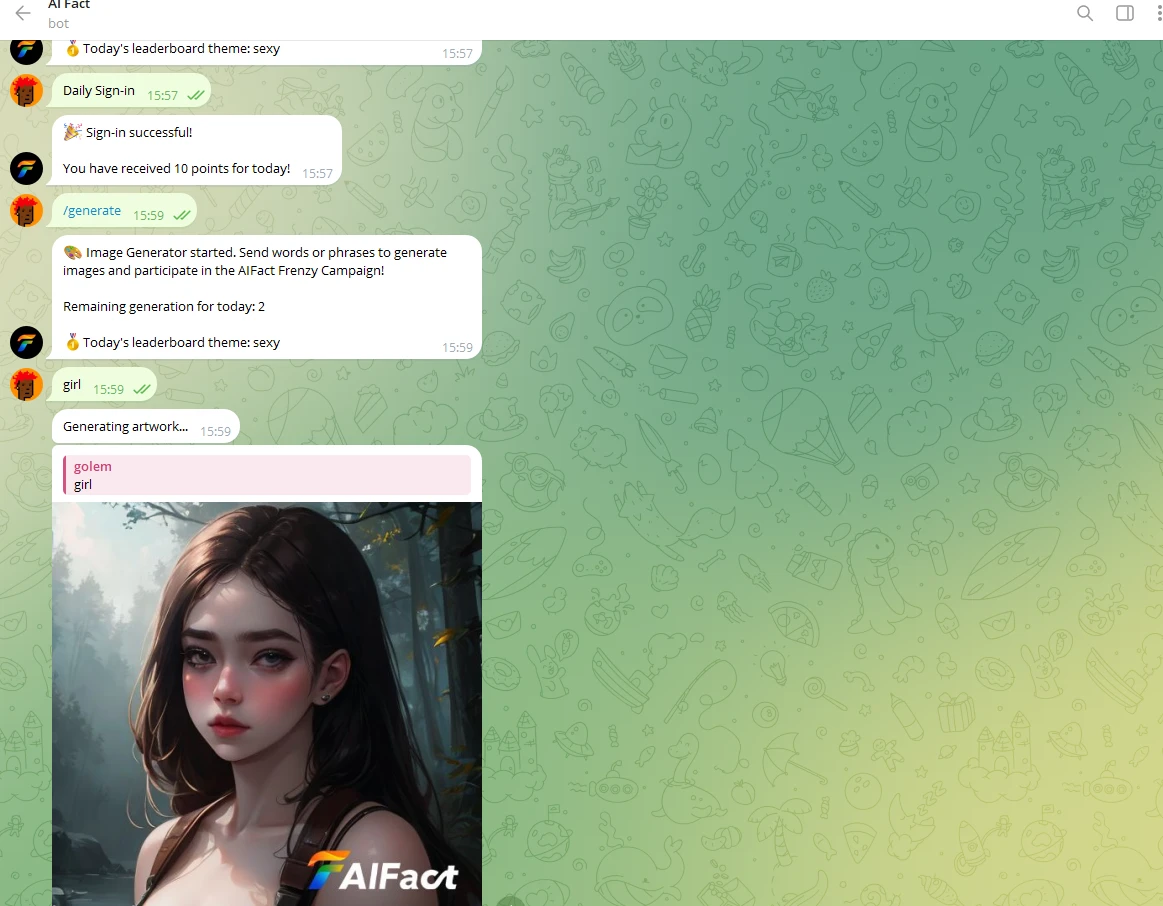 AI Fact 是一个使用关键词 AI 生成图片的 Telegram 机器人,最近也在进行积分活动。玩家根据每日主题使用 AI 生成图片参与排行榜赚取积分,同时也可通过每日簽到和邀请好友赚取积分。
