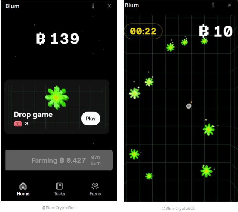 Blum 是由币安前高管创办的混合交易平台,4 月 19 日上缐了 Telegram 小程式,但交易功能还未上缐。使用者可以通过 Farm 和 Drop game 来获取积分,邀请新使用者可获得 Drop game 门票且可获得额外积分。目前 Blum 使用者已经突破 3000 万,其频道号位居 Telegram 全球周榜 TOP6。