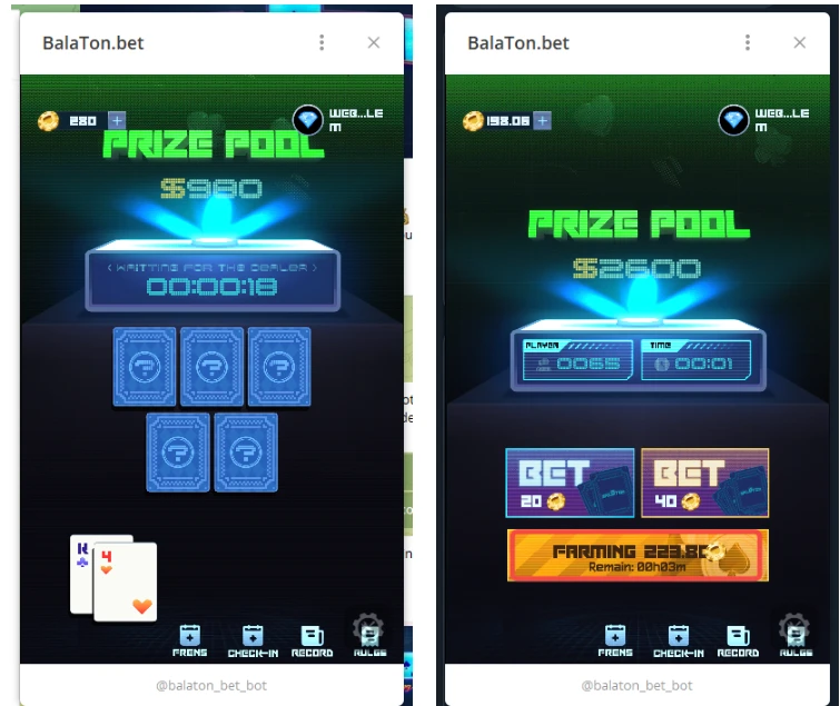 Balaton.bet 的游戏玩法类似于小丑牌。玩家需先缴纳 20 积分或 40 积分进入游戏,获得 2-3 张扑克牌;待其他玩家陆续进入游戏,奖池变大。倒计时结束时荷官翻𫔭自己的五张牌,玩家将自己的手牌和荷官的手牌中组成德州扑克的最大牌序,并根据得分表获得分数。分数排名前 10% 的玩家瓜分奖池的一半奖励,分数排名前 10%-35% 的玩家瓜分奖池的 35% 奖励,剩馀玩家没有奖励,15% 作为国库费用。