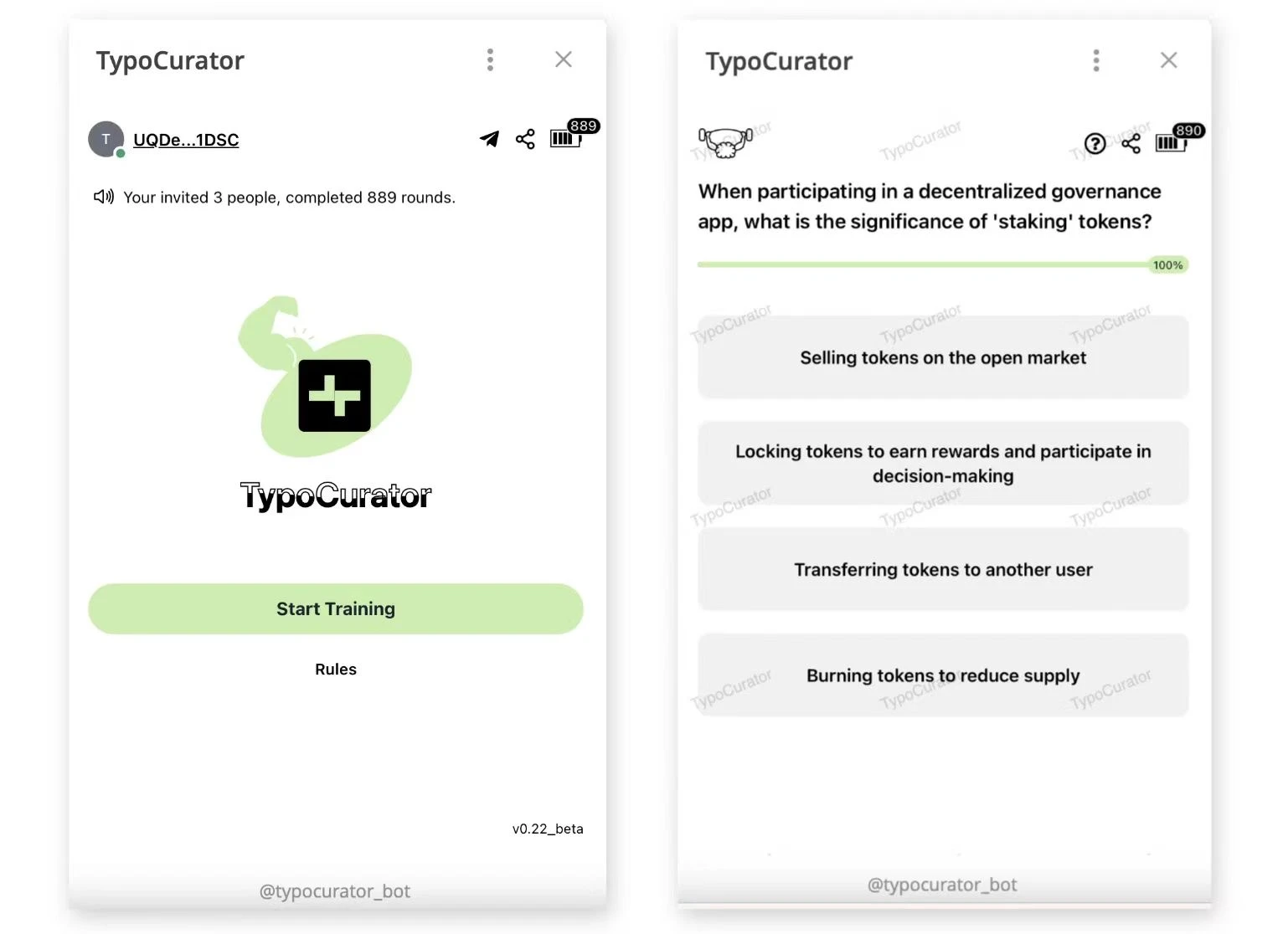 TypoCurator 将 Tap 2 Earn 和 AI 资料训练标註相结合,使用者可以在 Telegram 的小程式中完成资料标註的答题,并获得 TPX 的奖励。每个使用者初始有一次任务配额,一次任务回答 20 个问题,使用者也可以通过邀请新使用者或使用 TPX 购𧹒获得更多配额。