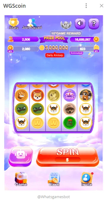 WGScoin 是一个将 meme 与游戏相结合的 Telegram 小程式,使用者可通过经典的转盘游戏 Spin to Earn 和邀请新使用者赚取游戏代币 WGS。