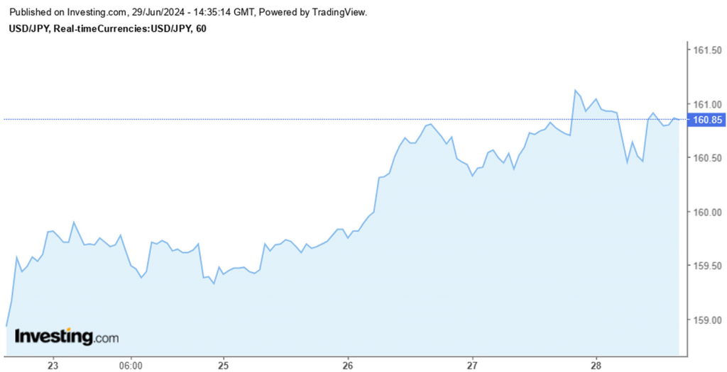 日圆持续下跌,我们可以缐上图上看到明显的政府出手干预,但显然没有被市场尊重,日圆续贬,徘徊在 160 左右的水準。日圆沦为大家上沖下洗的赌场,已经没有任何基本面在支撑,市场单方面在血洗日本央行和财政部。此外,日本央行正在就削减债券计划在日本公债市场参与者之问进行调查。