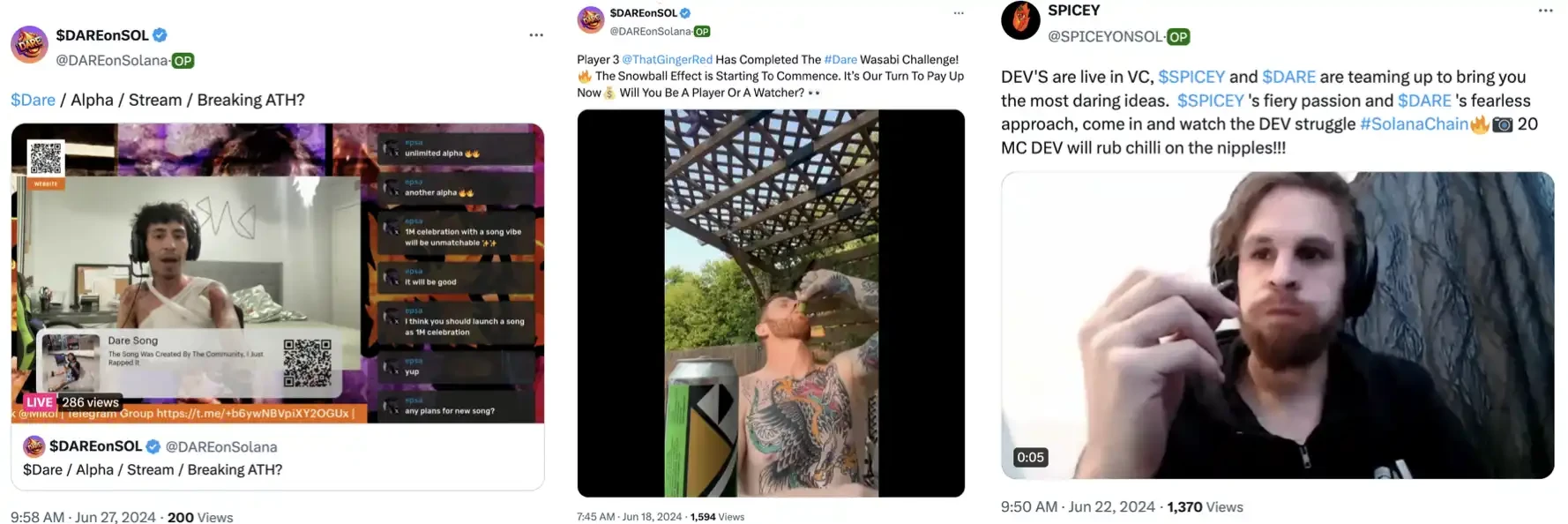 这个开发者名叫 Mikol, 5 月 17 日,他在 Pump.fun 上推出了一个名为 TruthOrDare(DARE)的 meme 币,当时 Pump.fun 还没有直播功能,只能在评论区发布图片,Mikol 身体力行地向社区展示第一季「亮点」,它在 twich 上直播往身上浇异丙醇,让朋友向他的方向发射烟花。在粉丝的惊呼和 DARE 的上涨中,他的身体被点燃,全身三度烧伤送往医院。