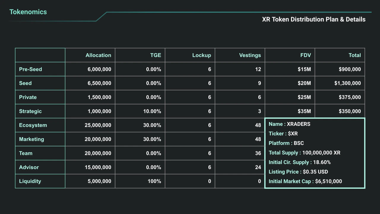 XRADERS 的经济系统将围绕 XR 进行,XR 作为项目的实用代币和治理代币,将发挥促进社区参与、治理运营和经济循环的作用。XR 总量共 1 亿枚,初始流通量和流通价格分别为 1860 万枚和 0.35 美元,即初始流通市值为 651 万美元。