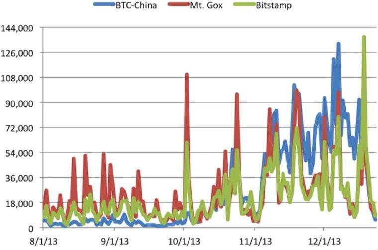 BTC China、Mt. Gox 和 Bitstamp 上的 BTC 交易量(2013 年 8 月 1 日至 12 月 23 日)。来源:BitcoinCharts