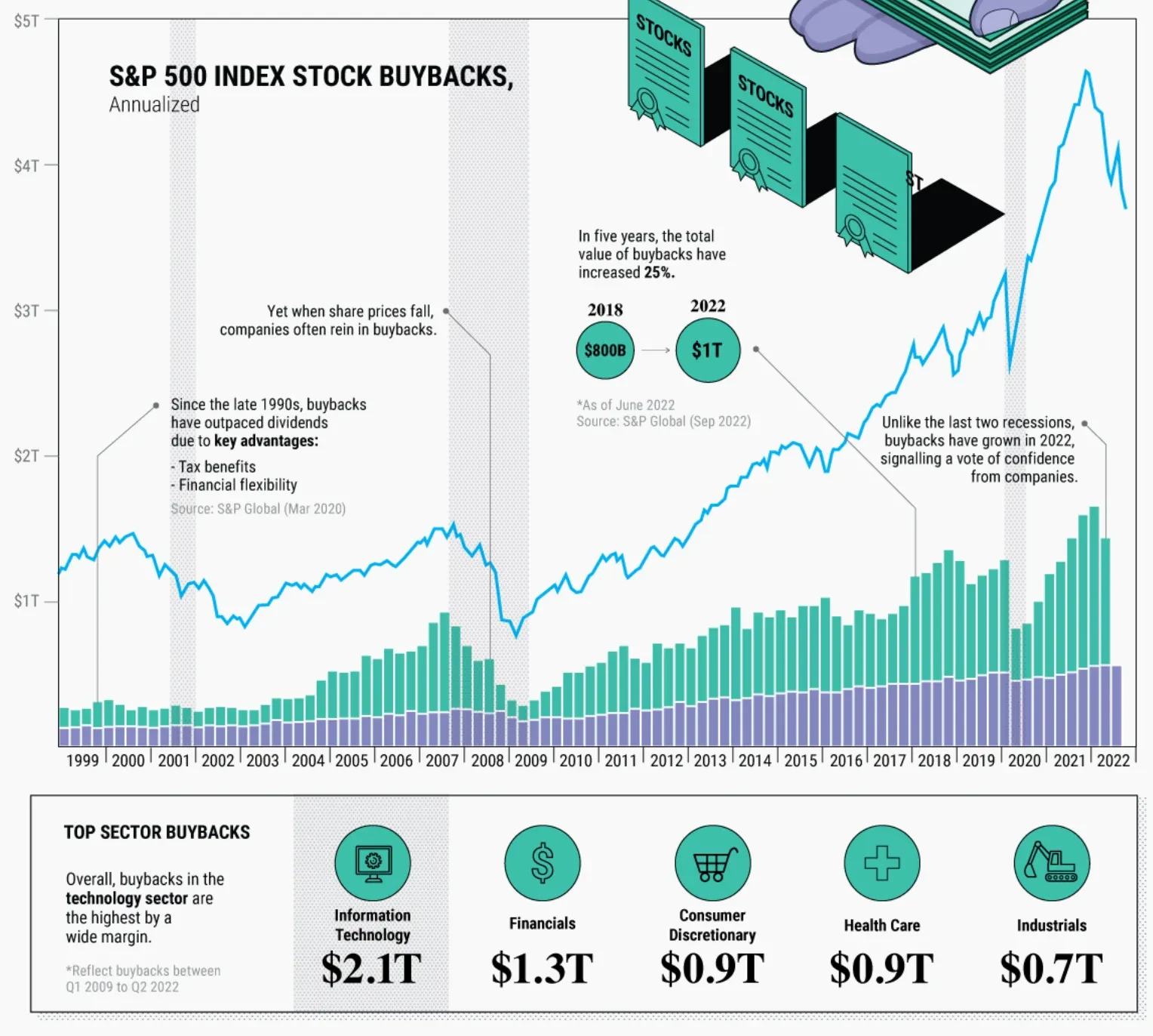 在私人资本市场,信贷被分配给最大化股东回报的企业。最简单的提升股价的方法是通过回购来减少流通股。可以获得廉价信贷的公司借钱回购自己的股票,而不是借钱增加产能或改进技术。改进业务以期望带来更多收入是具有挑战性的,并不一定能提升股价。但通过数学计算,减少流通股会提高股价,自 2008 年以来,拥有廉价和充足信贷的大型公司正是如此。