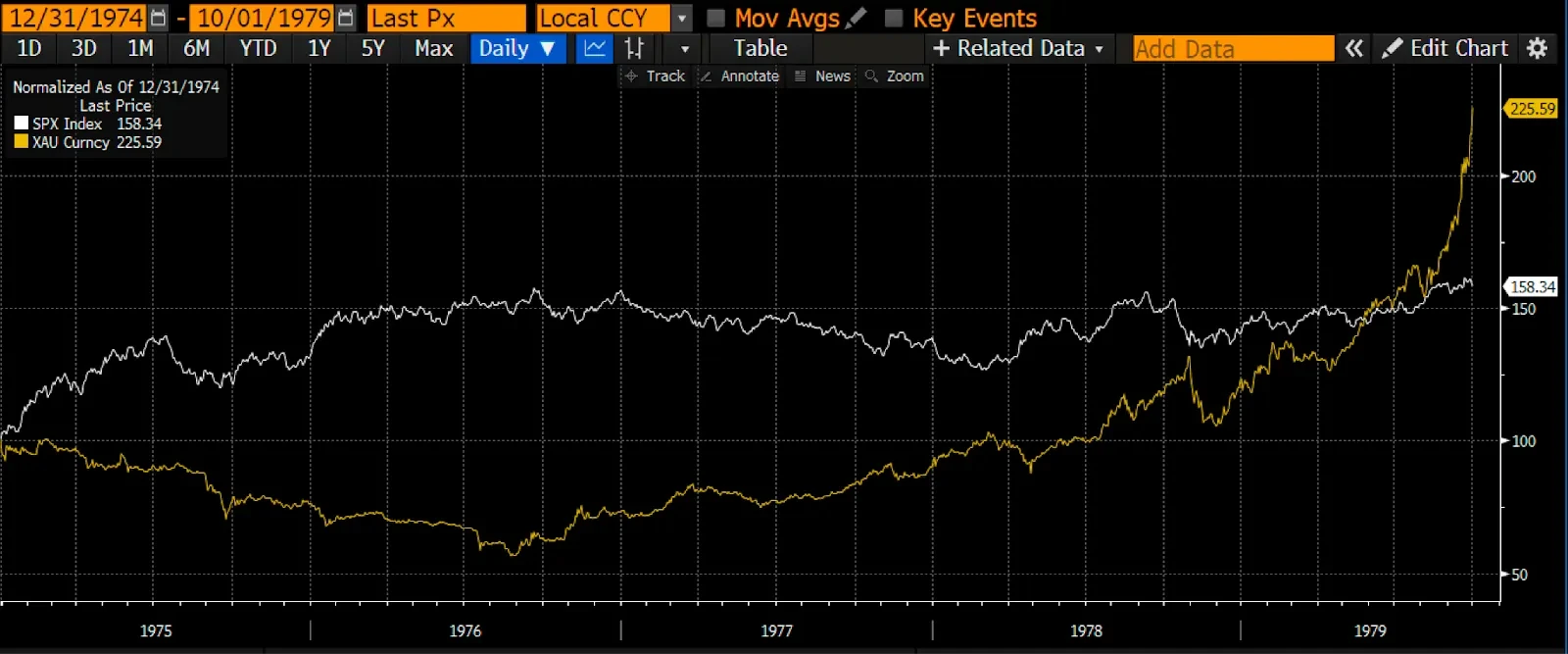 标准普尔 500 指数(白色)与黄金(黄金色),以 1974 年 12 月 31 日至 1979 年 10 月 1 日为基准,指数值为 100