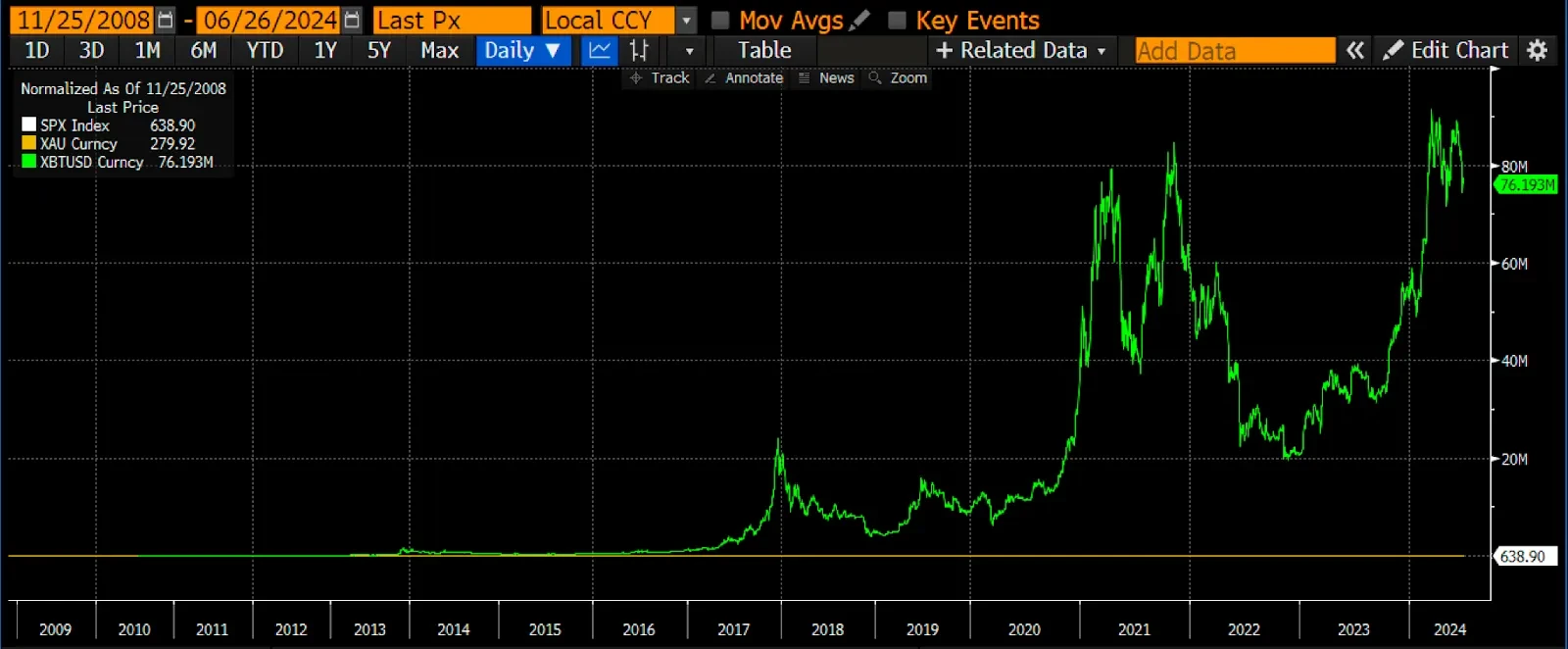 标准普尔 500 指数(白色) vs. 黄金(黄金色) vs. 比特币(绿色),以 2008 年 11 月 25 日至今为基准,指数值为 100