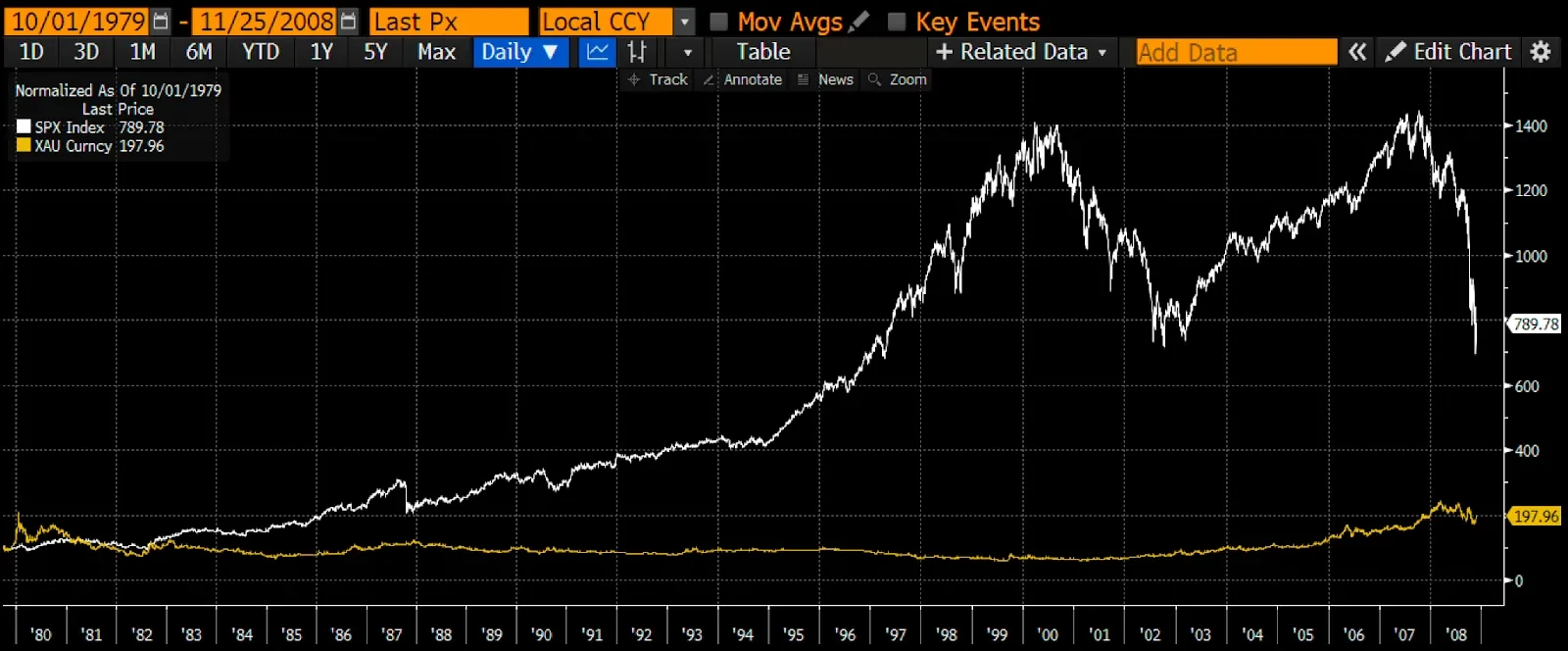 标准普尔 500 指数(白色)与黄金(黄金色),以 1979 年 10 月 1 日至 2008 年 11 月 25 日为基准,指数值为 100