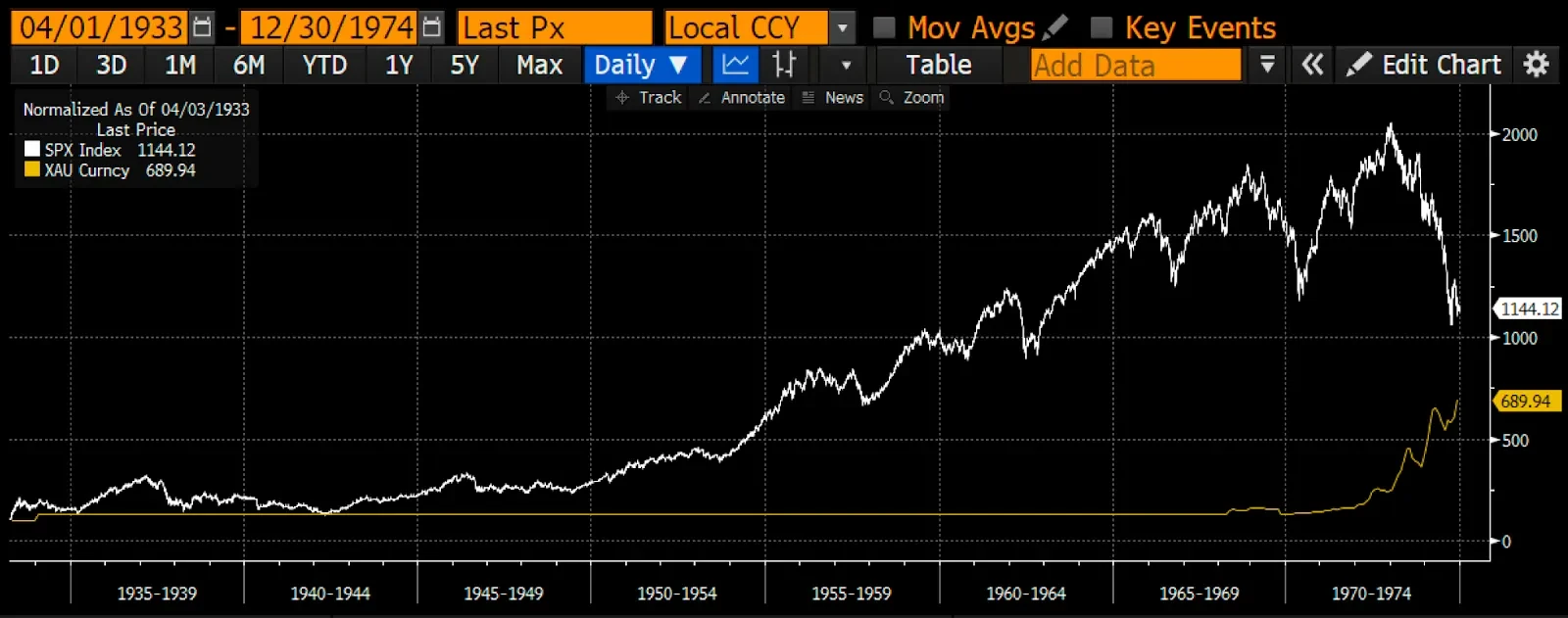 标准普尔 500 指数(白色)与黄金(黄金色),以 1933 年 4 月 1 日至 1974 年 12 月 30 日为基准,指数值为 100