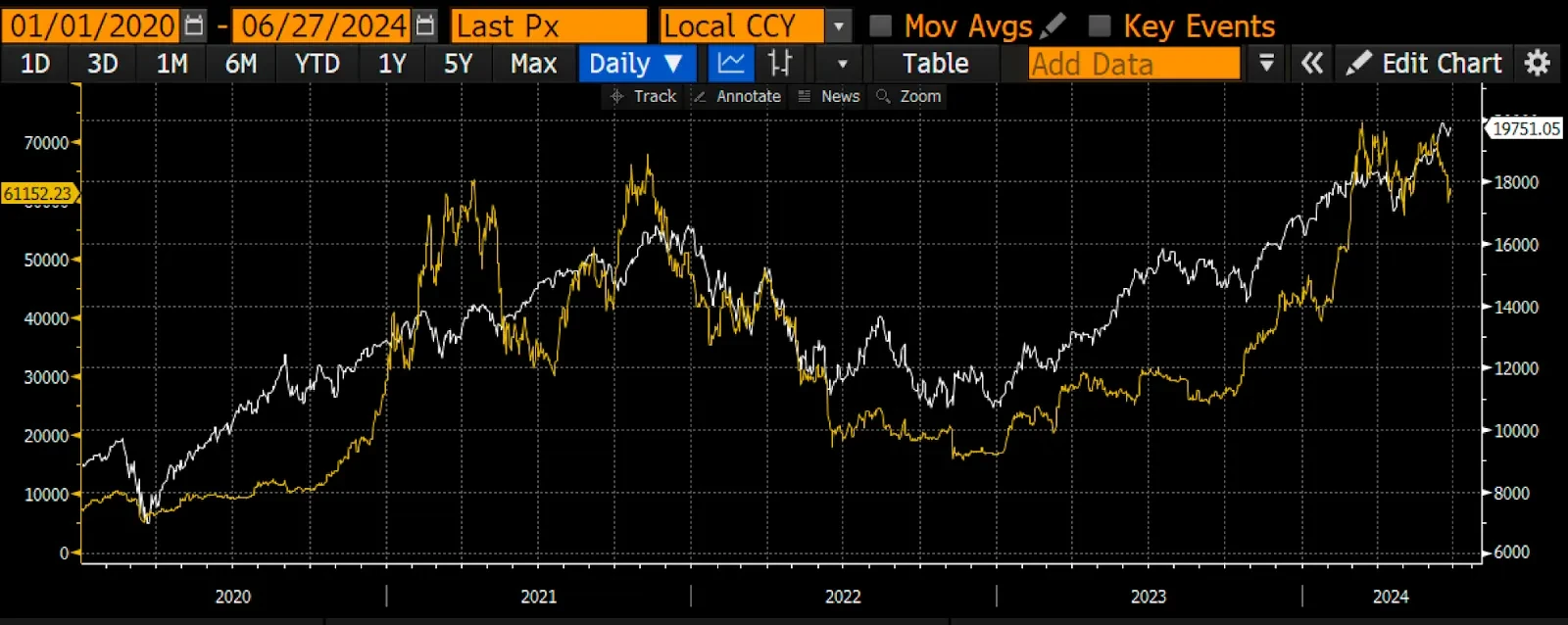 这张纳斯达克 100 指数(白色)与比特币(金色)的对比图显示,这两种资产的走势一致,但自今年早些时候创下历史新高以来,比特币的涨势已停滞