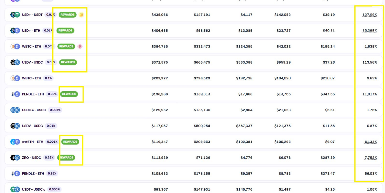 注意:这些是平均 APR;其中许多流动性较低,因此要特别注意稀释。