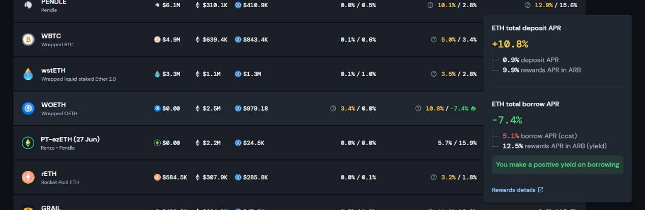 WOETH 抵押品目前在 ETH 上的借贷利率为-7.4% 。