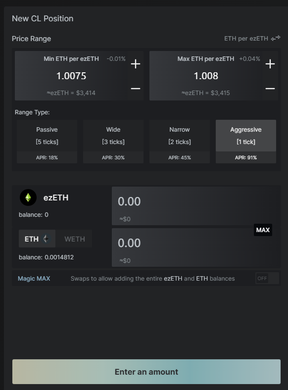然后,如果看看像 Renzo 的 ezETH/ETH 这样的代币对,可以更好地了解实际的合理收益率是多少。