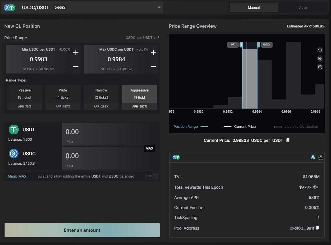 对于稳定币矿工来说,吸引他们的可能是 USDC/USDT,矿工可以为其设定 8 tick 为一个区间,并可以获得 73% 的 APR。
