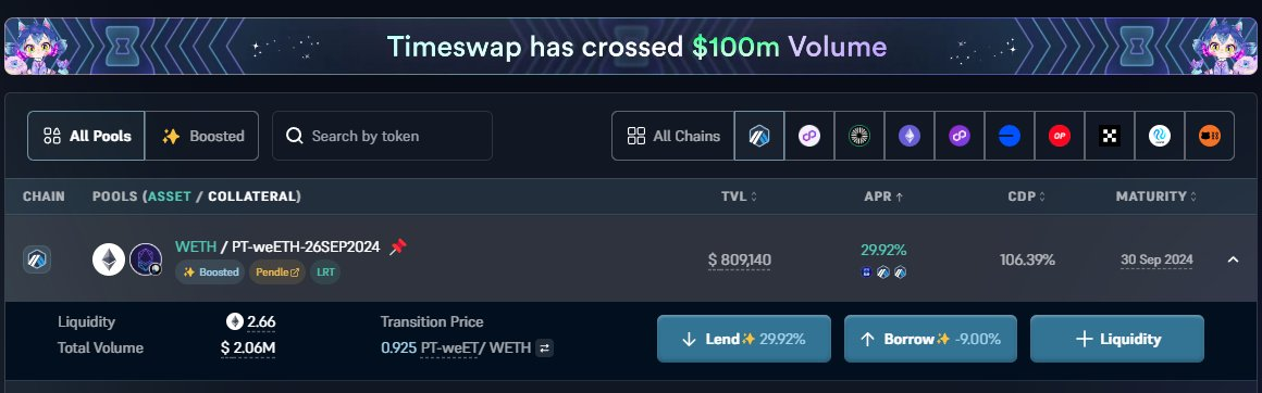 在这里,你借出 PT-weETH 可以获得 30% 的收益,而用抵押品借入 WETH 获得 9% 的收益。