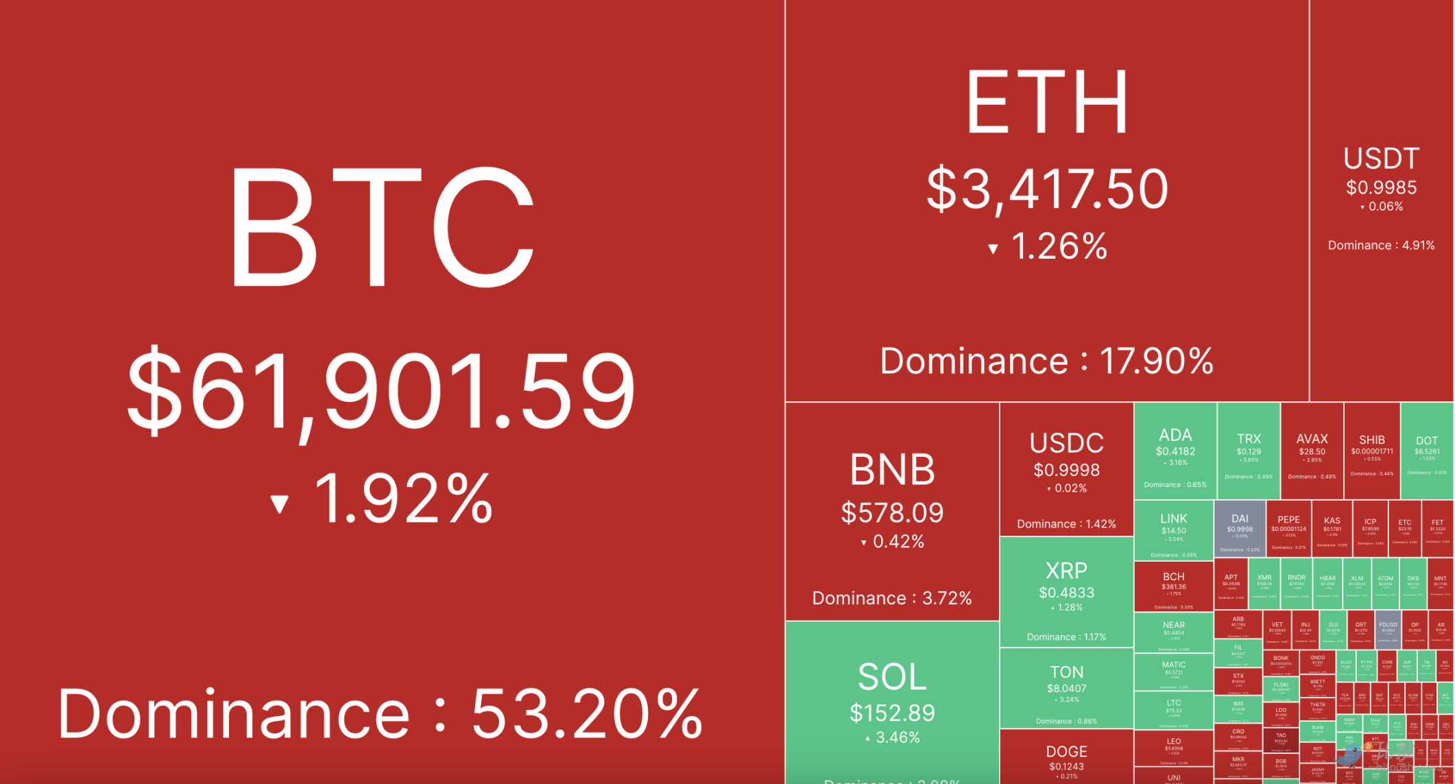 周二,加密货币市场处于窄幅波动模式。比特币凌晨交易价接近 63, 000 美元,在鲍威尔发表评论后出现下跌,下午触及 61, 730 美元的低点。截至发稿时回升至 61, 901 美元, 24 小时跌幅近 2% 。
