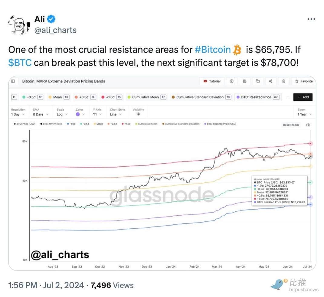 独立分析师 Ali Martinez 在 X 平台也提到了这一点,他表示,基于市场价值与实际价值的衡量标准,BTC 价格可能会在 65, 000 美元以上遭遇阻力。