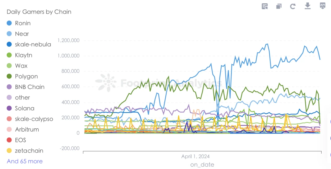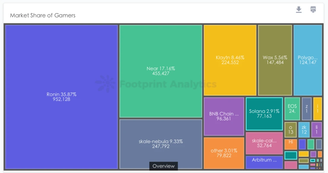 根据 Footprint Analytics 的数据,目前 Ronin 链在链游板块占据了大部分份额,占比 35.87% 。从 2023 年 3 月至今,GameFi 总市值虽然波动较弱,但整体市场行情好于去年。不同链上的游戏数据逐渐增加,尽管增长缓慢,但从 2023 年至今保持了上升趋势。