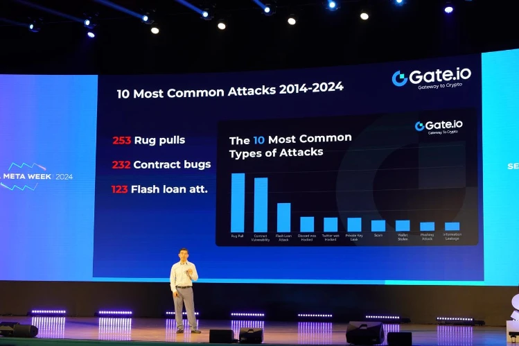 这种坦率的表述出自大型加密货币交易所 CEO 之口或许令人意外,但它反映了一个不争的事实。韩林在演讲中引用了 Gate.io 研究人员和 Chainalysis 的数据,揭示了加密货币领域的安全挑战。从 2014 年到 2024 年,最常见的事件包括抽地毯骗局(253 起)、合约漏洞(232 起)和闪电贷攻击(123 起)。值得注意的是,在 2021 年到 2023 年间,从平台被盗的加密货币价值高达 87 亿美元——与前三年大约 25 亿美元相比显著增加。尽管 2023 年被盗的加密货币总量与前一年相比有所下降,但事件数量却从 219 起增加到了 231 起。