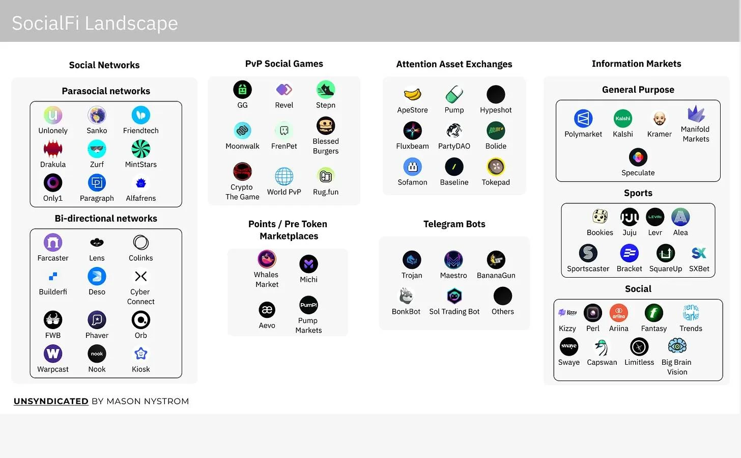 在过去的一年里,SocialFi 生态系统迅速增长,注意力资产交易所(如 memecoin 协议)、PvP(玩家对玩家)社交游戏、新形式的信息市场和金融化社交网络公司大量涌现。这一扩展的驱动力是加密基础设施在 可扩展性和可用性 两个方面的成熟,支持了新类型的消费者体验(例如移动 PWA)、更便宜的交易(例如 L2)以及通过改进的开发工具(如账户抽象和钱包即服务工具)实现的更快的应用迭代周期。