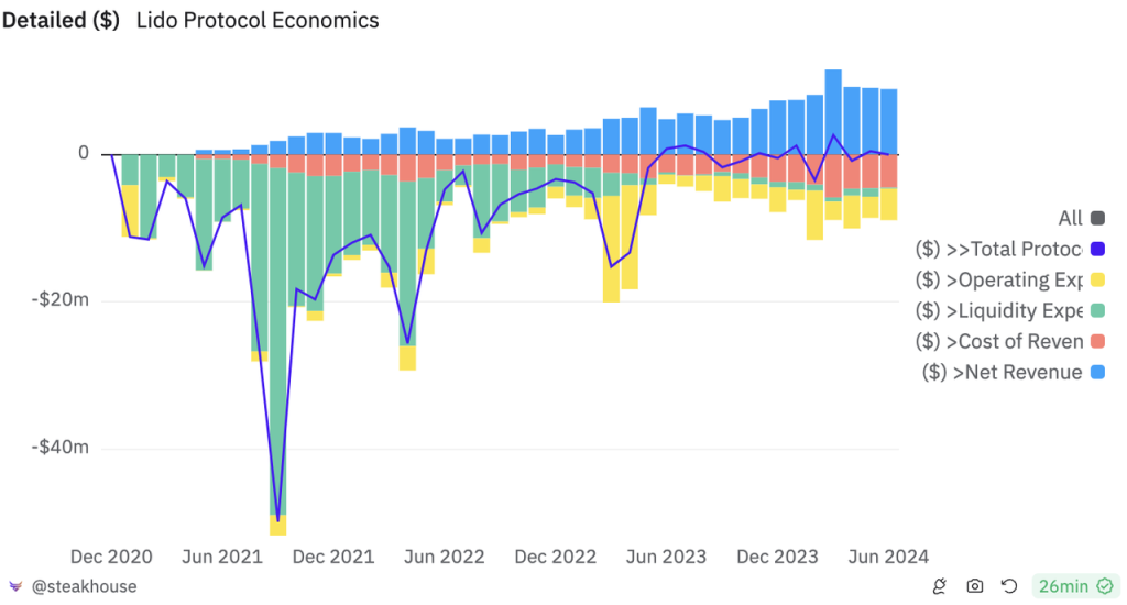 随着 Shapella 升级成功上线,Lido 的市场地位稳固,反应“收入-代币激励”指标的利润指标也表现出色,最近 1 年累计有 3635 万美元的利润。
